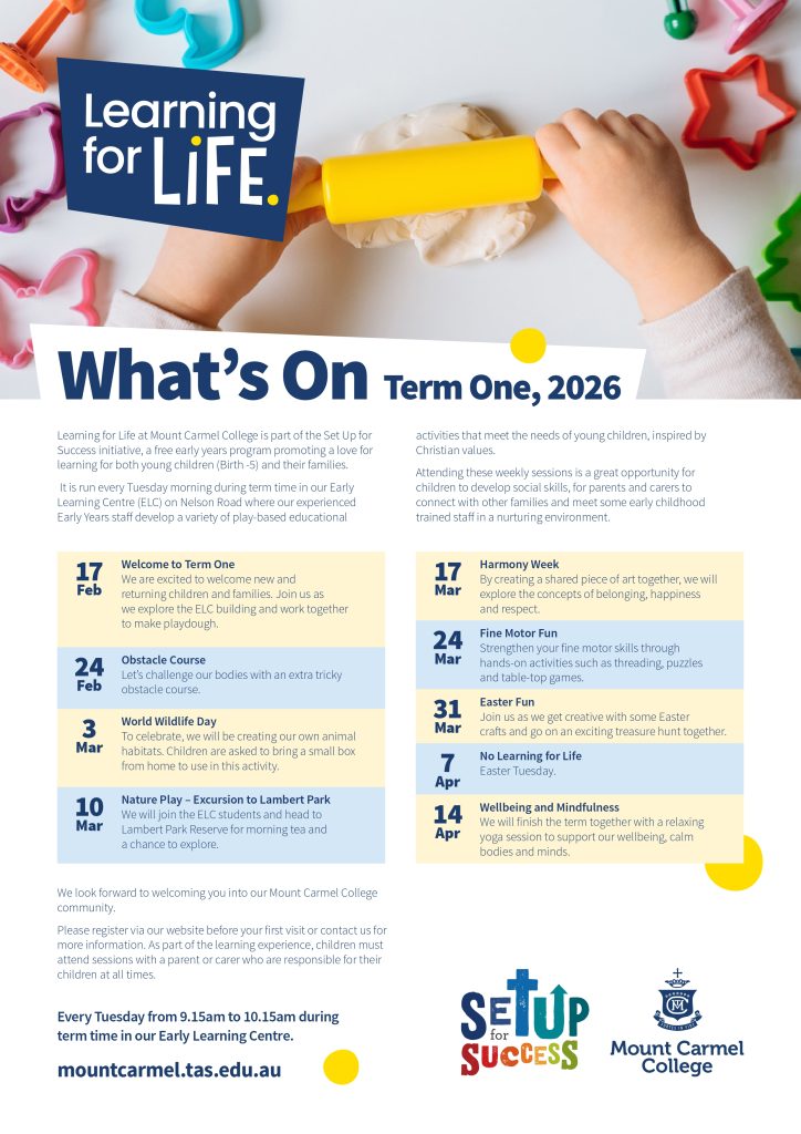 At Mount Carmel College our Learning for Life program is part of the Set Up for Success initiative, a free early years program prompting a love for learning for both young children (Birth – 5 years) and their families.
